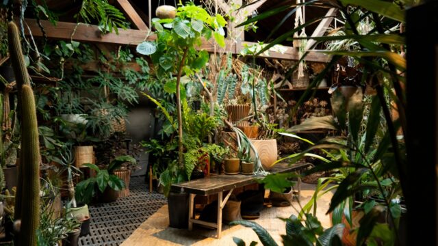 2階建ての大きな倉庫を改装し、高い天井と剥き出しの梁が、並ぶ植物の生命力をより一層引き立てています。