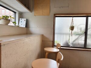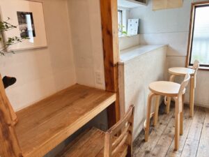階段を登った先がカフェスペース。木の床がいい感じに渋みを増して、年月を経て濃く浮き出た木の節がコーヒー豆の模様みたいだった。指定されたのは壁の凹みに板を張った半個室のような1人席。1人カフェには最高の席。