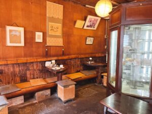 和風な店内に洋風な六角形の冷蔵庫。掛け軸はよく見るとこの店のロゴが描かれていて、なんだかへのへのもへじみたいだ。畳の巻かれた椅子や座布団、ピザみたいな形のテーブル…どれもこれもこの店だけの特別仕様。