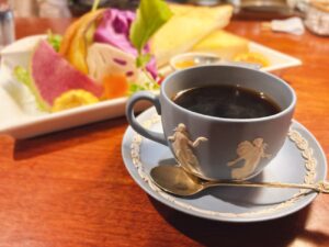 やや遅れて届いたコーヒーはなんとウェッジウッドのカップ&ソーサー!深い切れ目からバターがしたたりそうなトーストを頬張りったあと、やや緊張しながらカップを唇へ。酸味が少なく軽やかな苦味のコーヒーは飲みやすくて美味しいから困る。なぜかってこのプレミアムなカップでできるだけ長くコーヒーを味わいたいから。