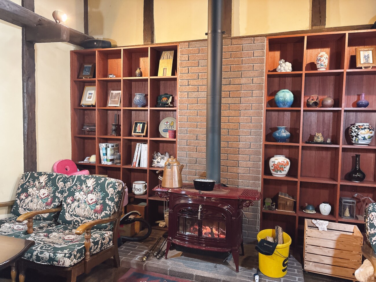 米蔵を改装した落ち着いた空間の壁には海外製の個性的なアイテムと薪ストーブ。近くに寄ると暖かさと火の揺らぎが日頃の疲れを溶かしてくれる。