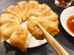 山女の円盤餃子はコロコロとして丸っこい。プツプツと泡状の焼き目がついているのは、多めの油で揚げ焼きした証拠だ。外側はカリッカリで、耳の部分に至っては薄焼き煎餅のようなのに、内側にはしっかりモチモチ感が残る。